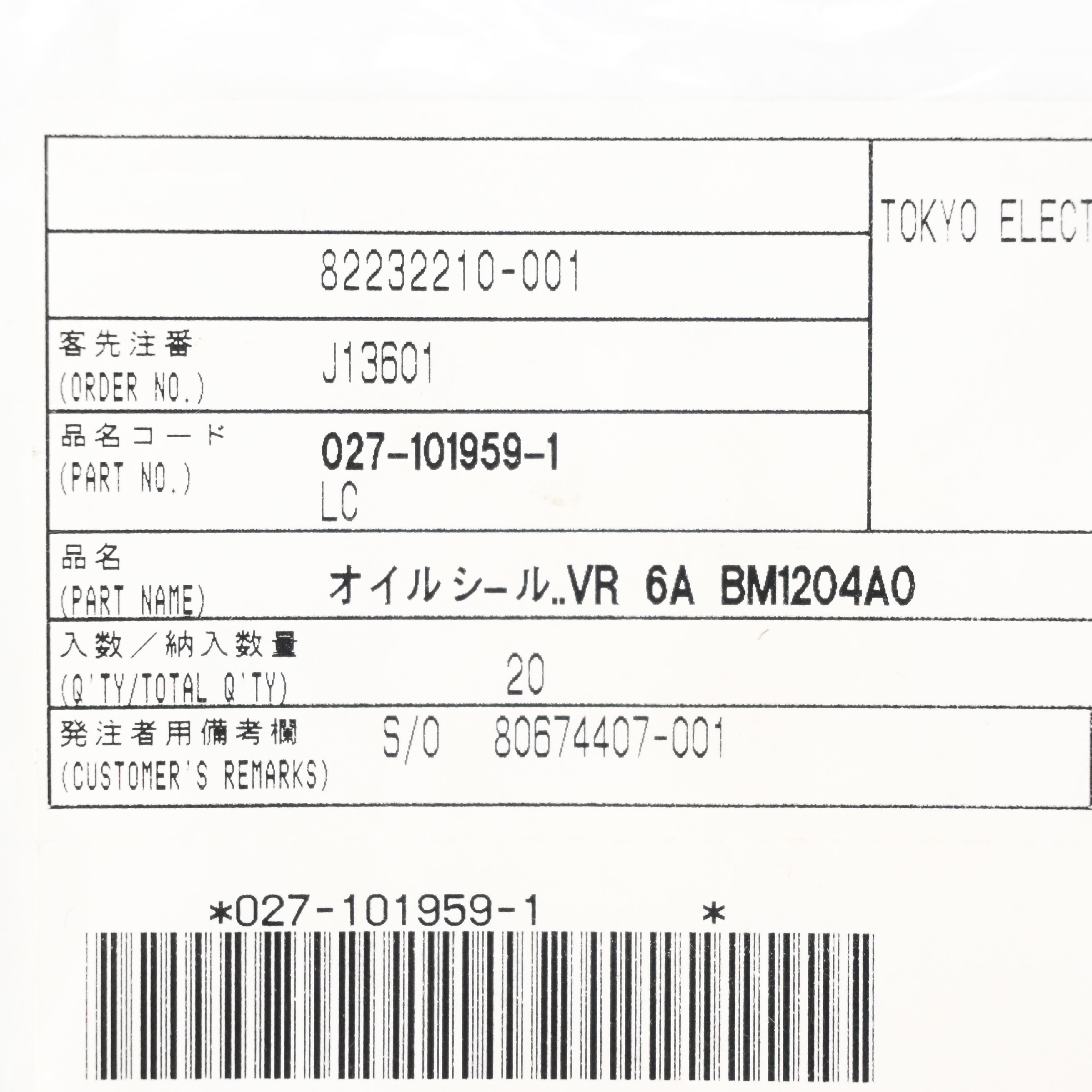 027-101959-1 オイルシール 東京エレクトロン (TEL)