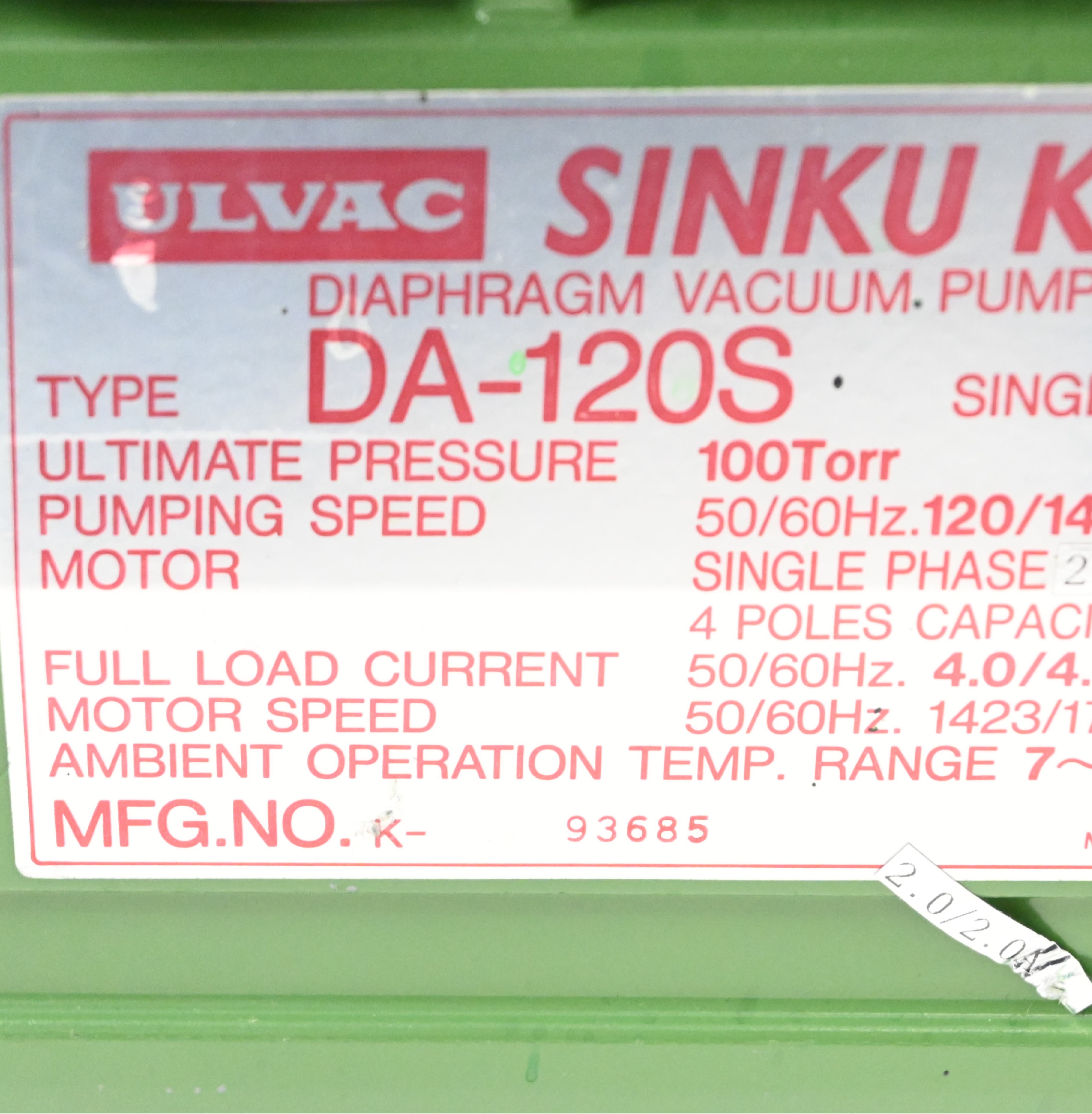 DA-120S ダイアフラム型ドライ真空ポンプ ULVAC